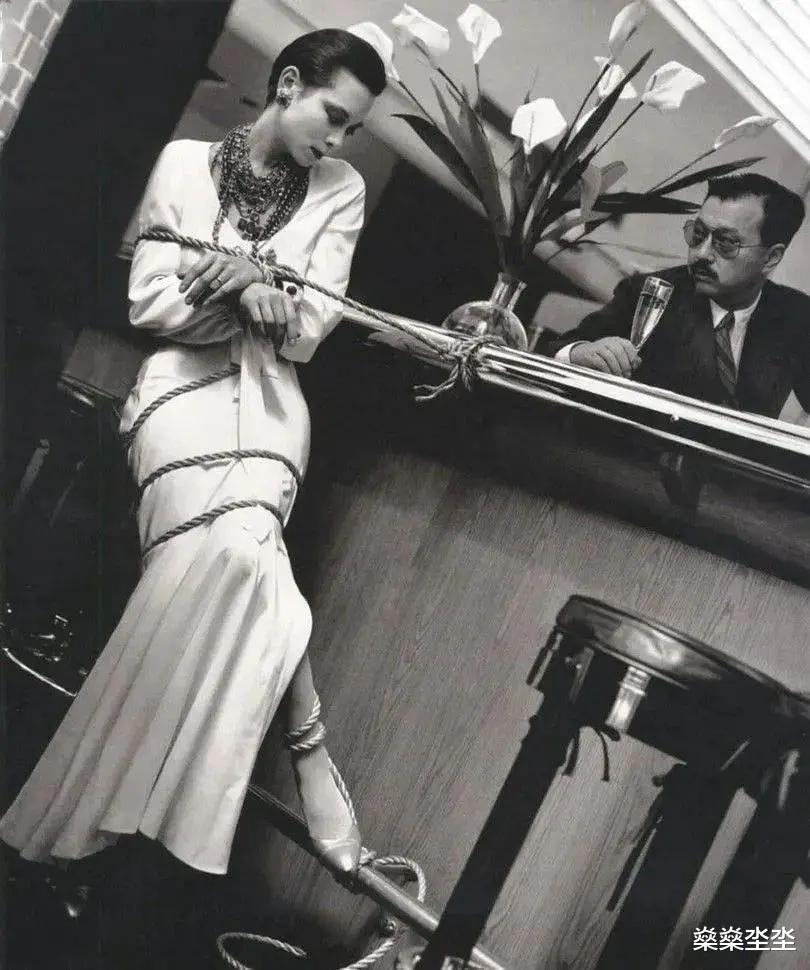1985 年,赫尔穆特·牛顿为这对夫妇拍摄了一张有趣的照片。照片中,两人被酒吧柜台隔开,周英华戴着一副墨镜,手持酒杯,凝视着妻子;而周天娜身穿白色长裙,低垂着眉眼,被麻绳牢牢困在吧台上……
