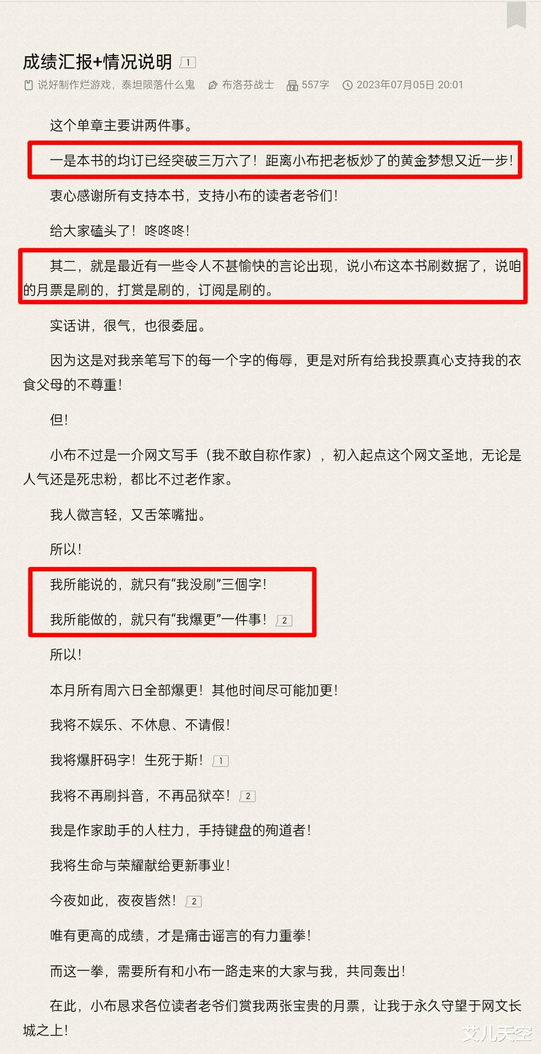 晚上看到泰坦陨落的作者发单章,其中提到小说均订已经三万六,为了应对有些读者说他刷票刷打赏订阅的指控,他准备用爆更,来争取更好的成绩作为回击。印象里小说上架前就有人说他抄袭,他还鼓励说他抄袭的人赶紧做调色盘来着。