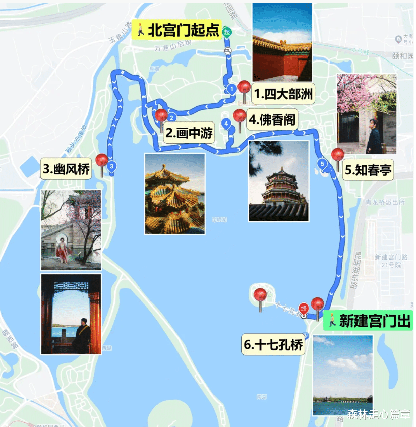(划重点)!!入口处选择:选择新建宫门处入如果选择常规的北宫门入,你即将面临爬一个山丘,虽然有苏州街这个景点,但在修缮中,没必要的。 路线: 从新建宫门进入后就是十七孔桥,登上南湖岛,从南湖岛做船到清晏舫,正好可以欣赏佛香阁(单程票价40,时间五分钟)。经过长廊,登佛香阁(我们没进去,不想爬楼),乐寿堂。最后从东宫门出,步行差不多九百米到地铁站。