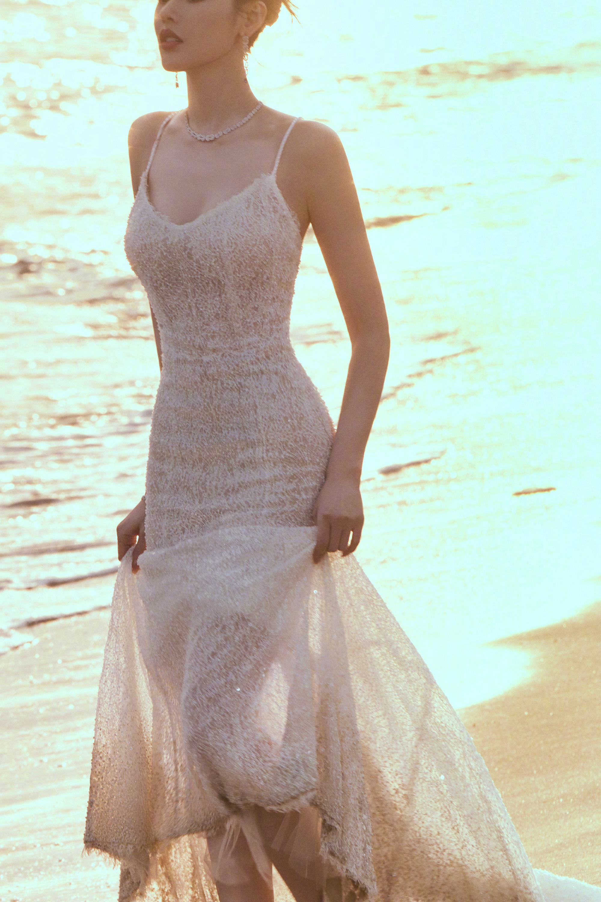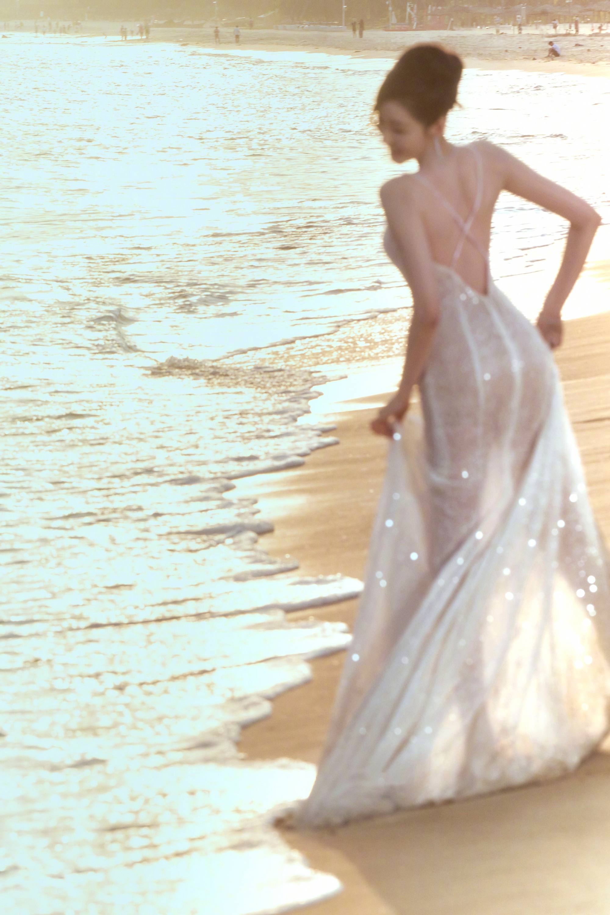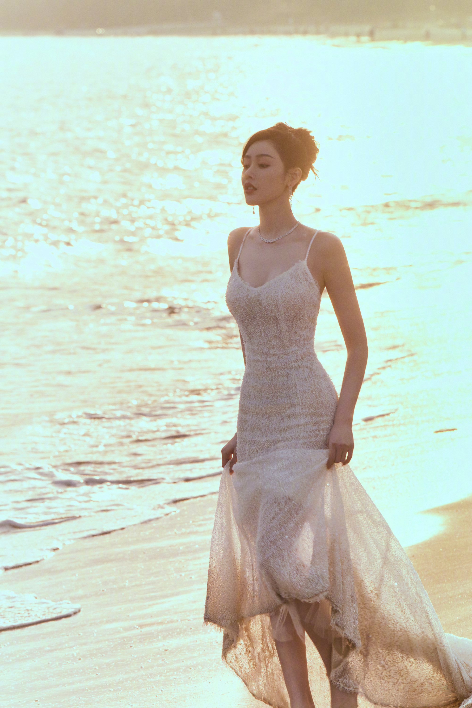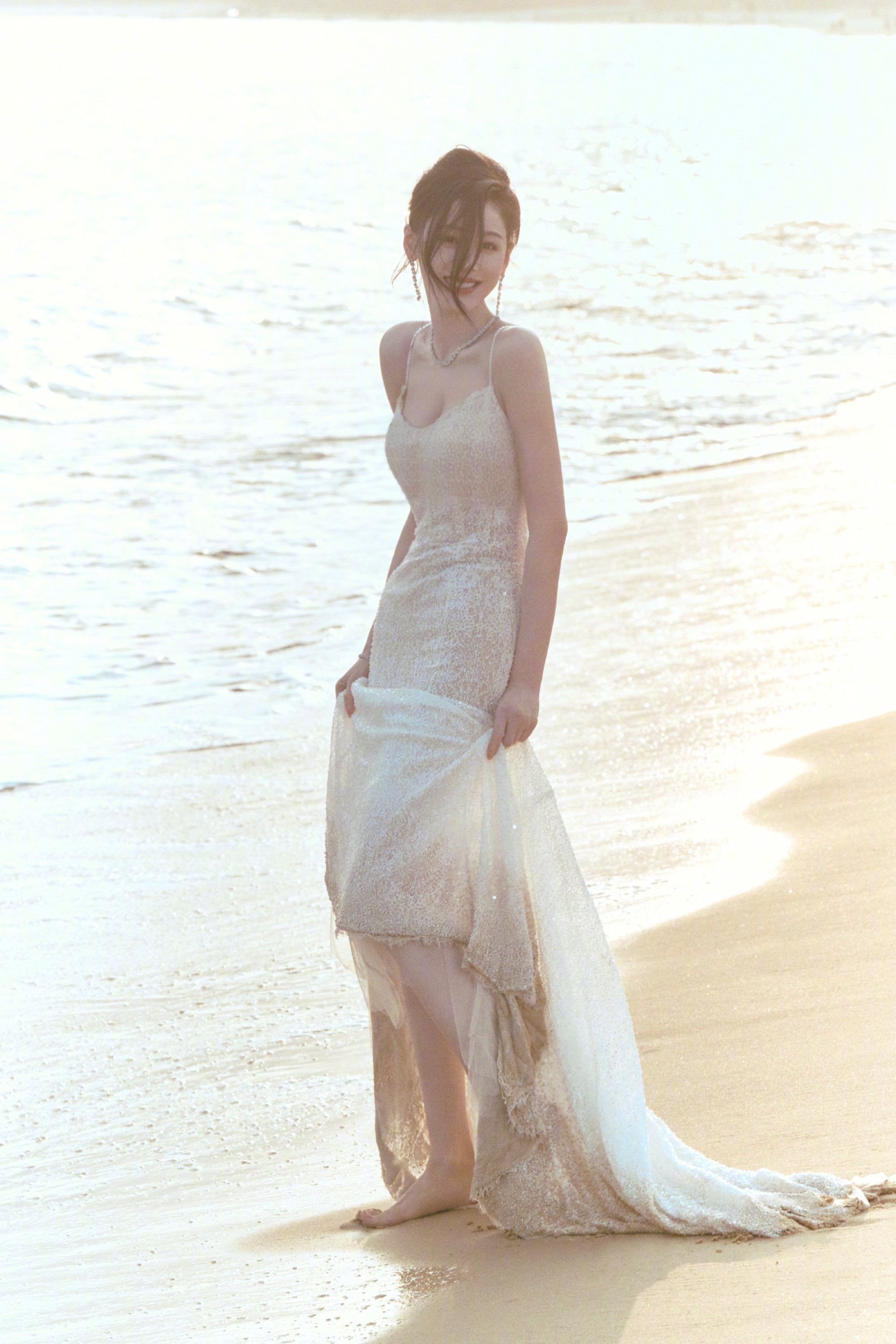 张天爱身着一袭白色蕾丝吊带裙,轻盈地漫步在沙滩上,宛如一位优雅的女神,散发着迷人的魅力。裙摆随着海风轻轻飘动,仿佛是海浪中绽放的白色浪花,美得令人窒息。