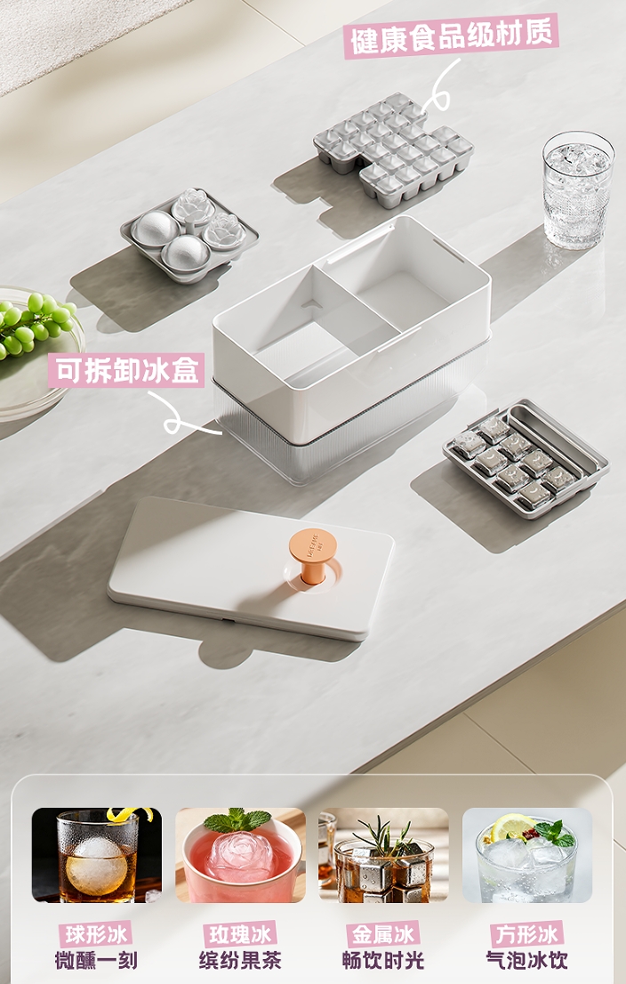 它可不是普通的制冰盒!一个模块就能做出球形、方形、玫瑰花瓣形、甚至金属冰!周末调杯莫吉托放上玫瑰冰,闺蜜直接拍照拍到停不下来;老公喝威士忌也用上了老球冰,在家就能复刻酒吧同款高级感~