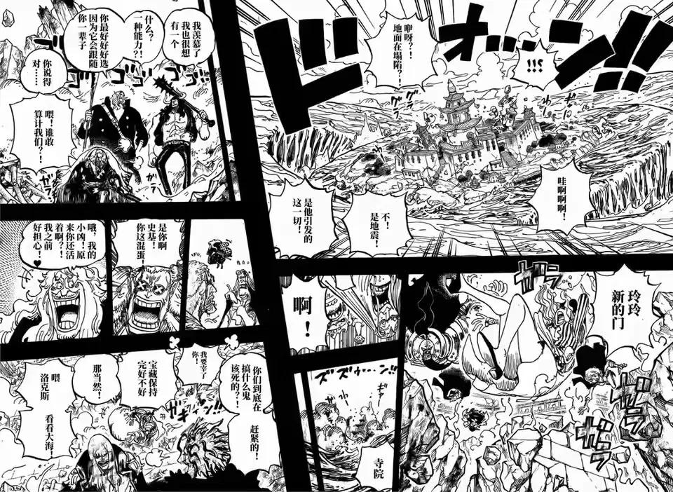 大妈和王直等人正在逃跑,他们被铁门困住了,暂时无法逃出来,金狮子扔了几个手榴弹进入通道里面,想要炸死大妈等人。白胡子开始使用震震果实,直接把整个岛屿都震飞起来,大妈和其他人都获救,他们把矛头指向金狮子。