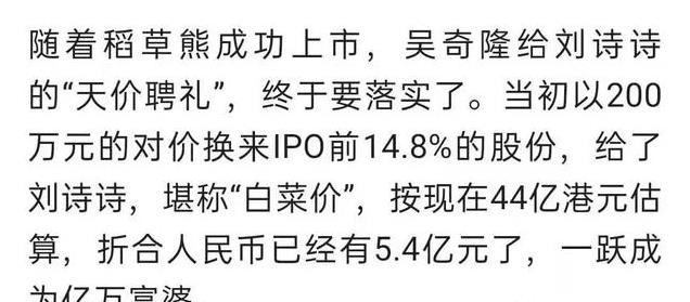 其中吴奇隆做得最好的是影视公司,他和刘诗诗结婚的时候,不仅花费了2000万办婚礼,还送了刘诗诗自家公司价值1.5亿的股份,之后吴奇隆的公司成功上市,刘诗诗手上这1.5亿元股份涨到了5.4亿元,被外界称为“天价聘礼”。