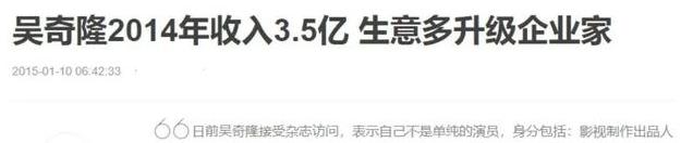 之后吴奇隆一边做艺人一边做生意,包括餐饮业,宠物店,影视公司等等。2014年的时候,吴奇隆的年收入高达3.5亿元。