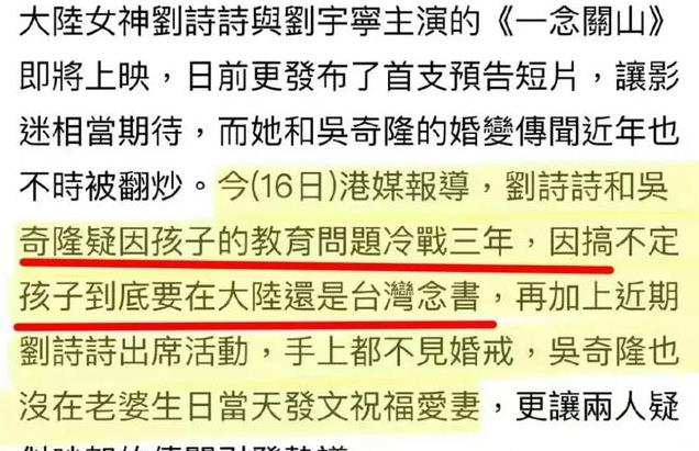 刘诗诗和吴奇隆这段相差17岁的“老夫少妻”婚姻虽然维持了快10年了,但似乎一直都不太被看好,两人的婚变传闻已经不是第一次传出,去年和今年都分别传过两人离婚的消息,有一次说的是两人因为孩子在哪里读书发生争执。
