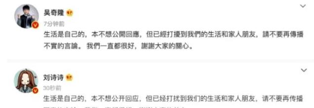 但其实这些传闻都是有待考究的,反而是刘诗诗和吴奇隆曾经发文否认过婚变传闻。