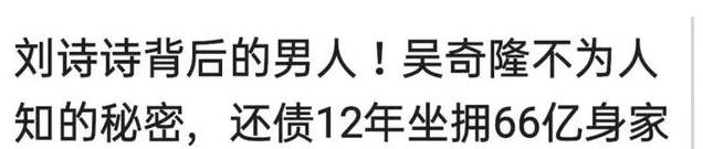 要知道,出道超30年的吴奇隆事业巅峰期和妻子刘诗诗不是同一个时间段,而吴奇隆一度被传身家高达66亿元,他的丰厚身家并不是靠拍戏而是靠做生意。