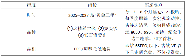 钱币收藏没有“晚”这一说,只有“贵”和“便宜”。当大盘连跌三年、大部分品种回到2016水位、且宏观流动性开始转向时,就是中线布局的“击球区”。2025年大概率是新一轮周期的起点,而非终点;选好品种、控好仓位、拿足2–3年,未来回头看,你会感谢现在入场的自己。