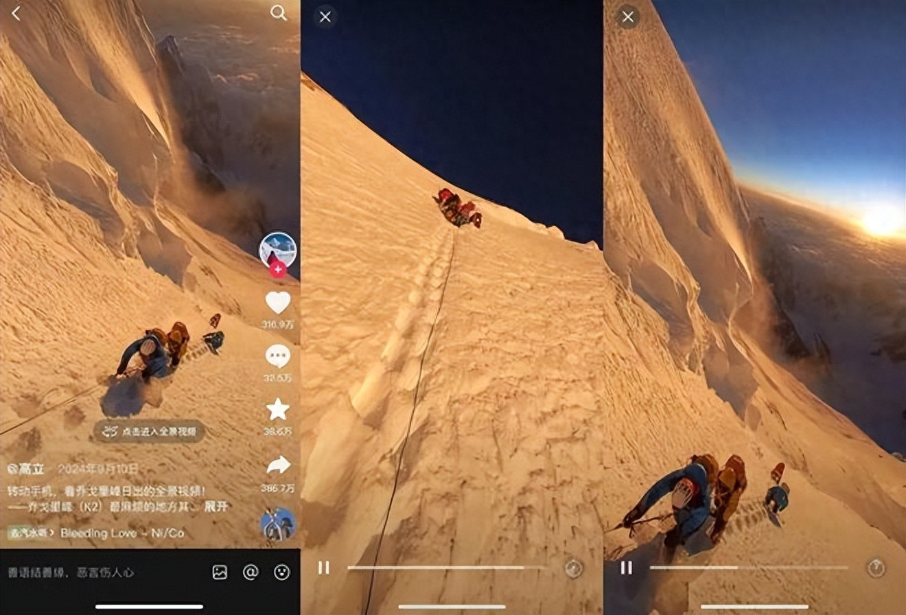 2024年,高立和他的团队向这座山峰发起了第四次挑战,不过与两年前初次登顶乔戈里峰有些不同的是,高立在这次攀登时,用影石全景相机记录下的乔戈里峰日出全景视频,在抖音收获了极为热烈的反响。