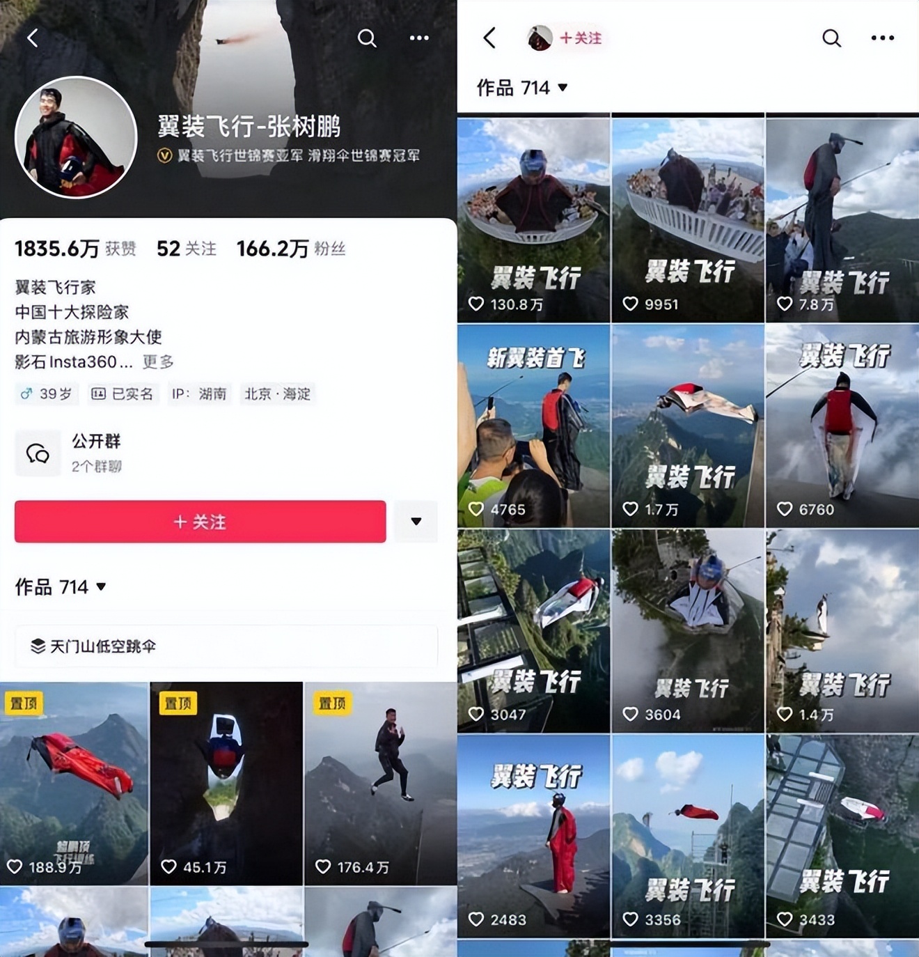 张树鹏身上有很多title,除了滑翔伞世锦赛冠军、翼装飞行世锦赛亚军外,他还是一名内容创作者,自五年前开始尝试将自己翼装飞行的训练过程发布到抖音开始,至今已经累积了160多万粉丝。