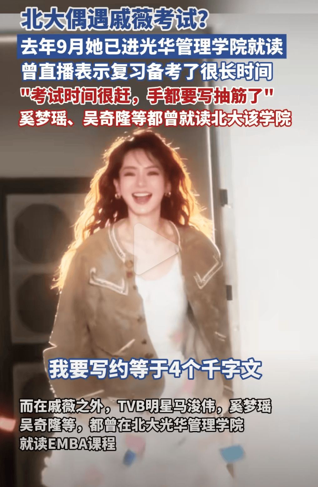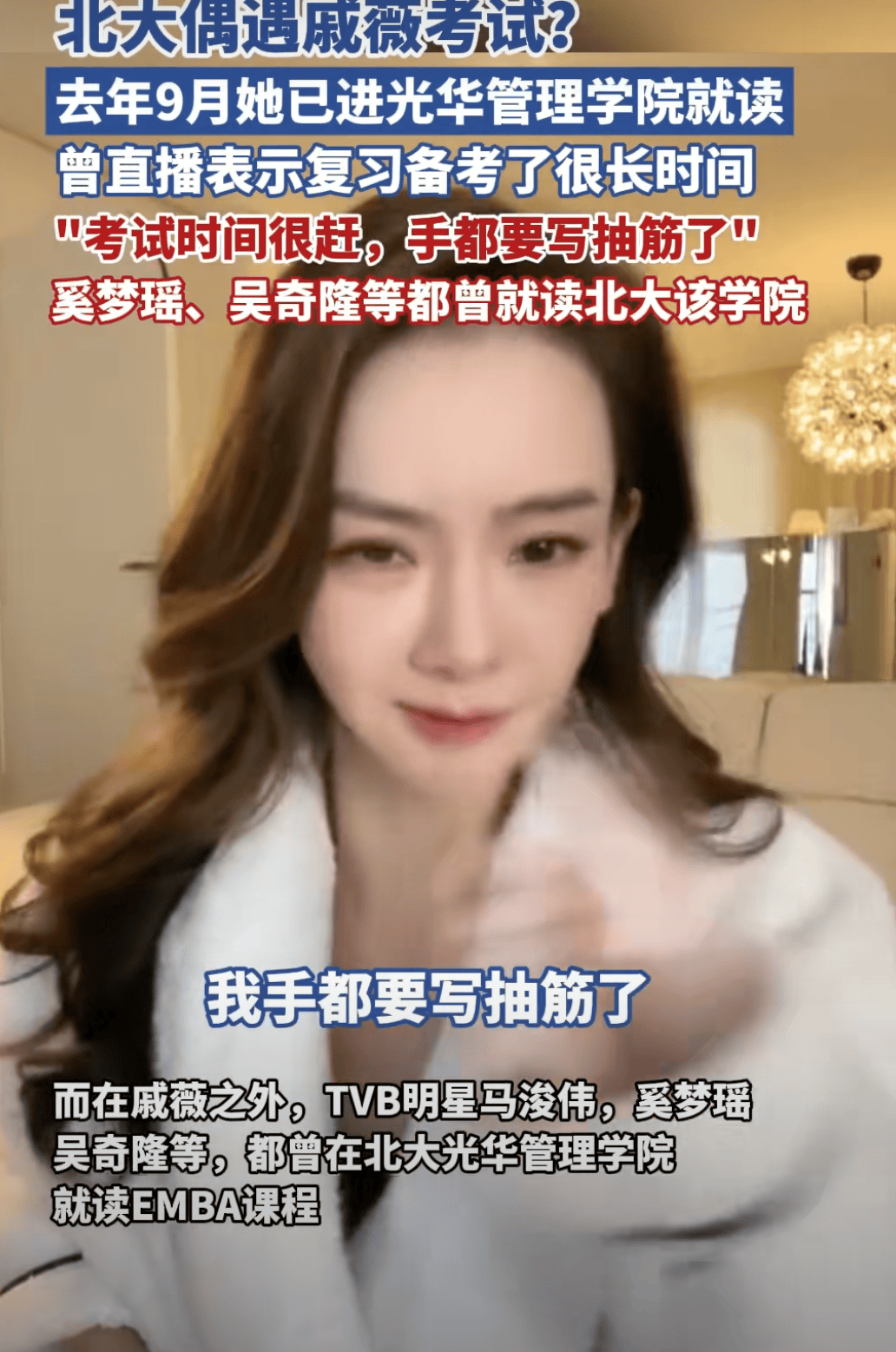 先说说最近被推到风口浪尖的戚薇。她在备考时那可真是拼了,考试要写3到4篇千字商业分析文本,硬是写到了手抽筋,最终初试成绩146分,超出当年录取线14分。要知道,北大光华EMBA可不是随随便便就能进的,除了要通过全国硕士研究生统考,还得闯过北大自主组织的面试关,英语、数学、商业答辩一样不少。申请者还得具备行业影响力或企业管理背景,部分人甚至需要推荐人担保。这门槛,简直堪比“学霸界的登天梯”,进去的要么是行业翘楚,要么是实打实的企业管理者。