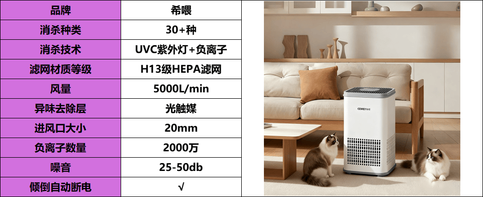 希喂搭载 H13 HEPA 滤网 + 光触媒 + UV 紫外线 + 负离子系统 的立体组合,能精准拦截并高效消杀空气中的大肠杆菌、金黄色葡萄球菌等 30+ 种病菌,并深度分解猫砂氨气、体臭等顽固异味。全程无臭氧释放,也无化学制剂和胶水涂层挥发,对母婴及鼻炎患者家庭更加友好。