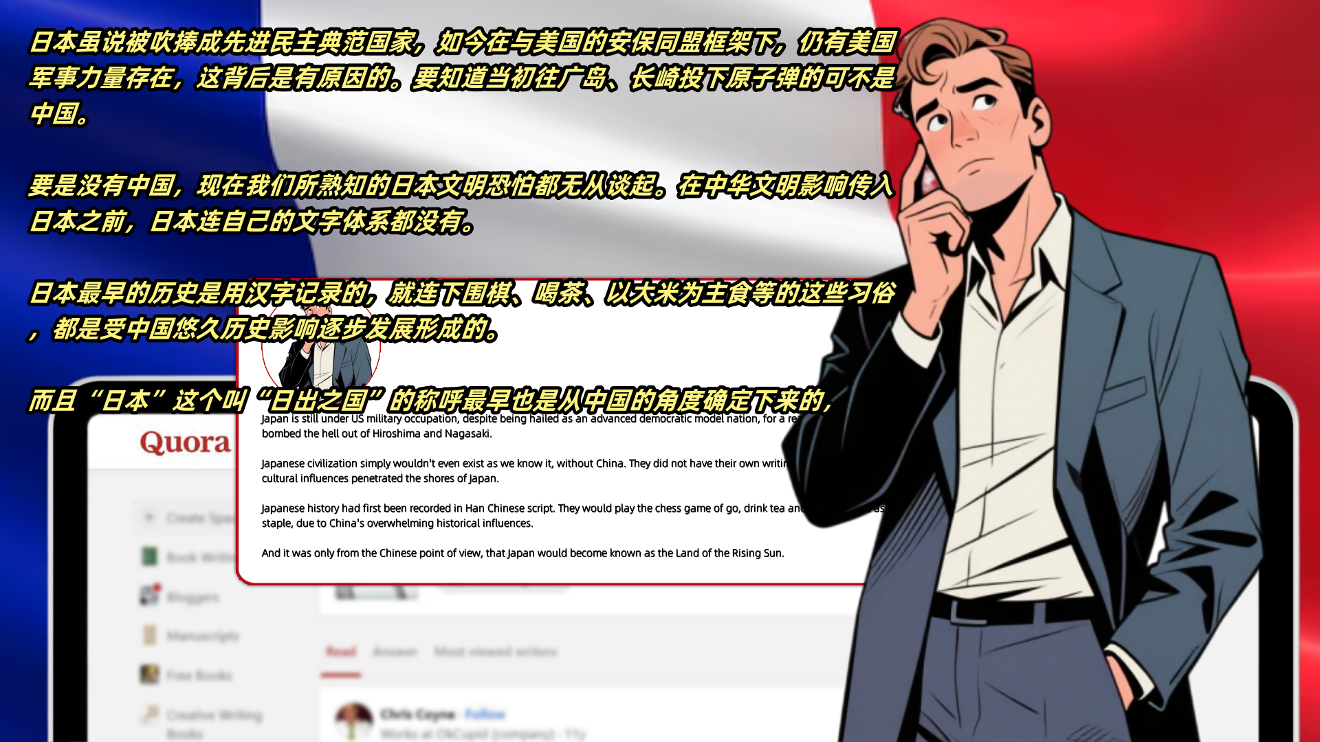 我们先来看看法国网友是怎么回答的,先戳了日本的“底”:日本虽说被吹捧成先进民主典范国家,如今在与美国的安保同盟框架下,仍有美国军事力量存在,这背后是有原因的。要知道当初往广岛、长崎投下原子弹的可不是中国。