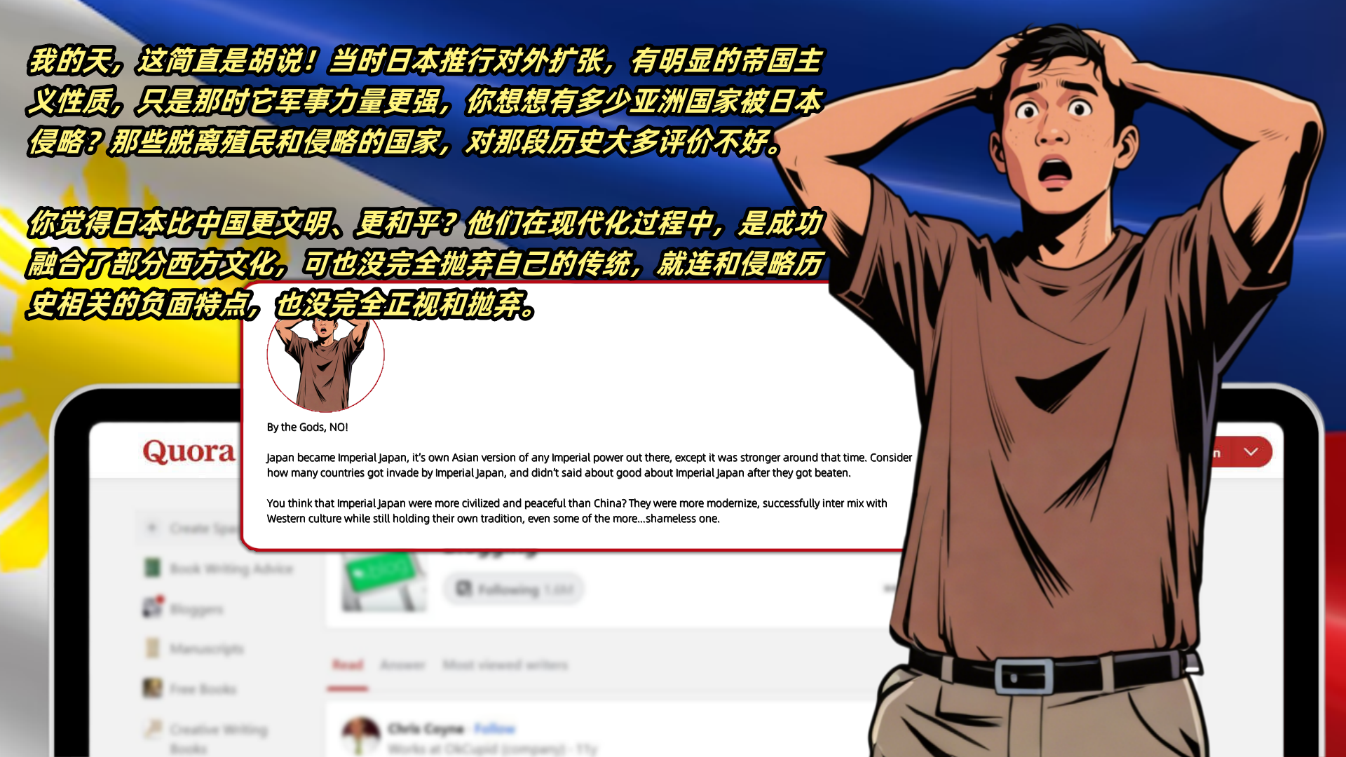 最后菲律宾网民直接急了:我的天,这简直是胡说!当时日本推行对外扩张,有明显的帝国主义性质,只是那时它军事力量更强,你想想有多少亚洲国家被日本侵略?那些脱离殖民和侵略的国家,对那段历史大多评价不好。