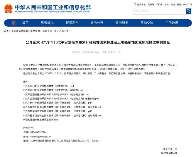 继辅助驾驶系统强制性国标开启征求意见后,业界传闻已久的禁止“全隐藏式”车外门把手设计,也有了明确消息。工业和信息化部装备一司对《汽车车门把手安全技术要求》强制性国家标准及三项强制性国家标准修改单公开征求意见,其中涉及行业所关注的“全隐藏式”车外门把手。标准起草组建议“安全技术要求”标准的实施日期为2027年1月1日。