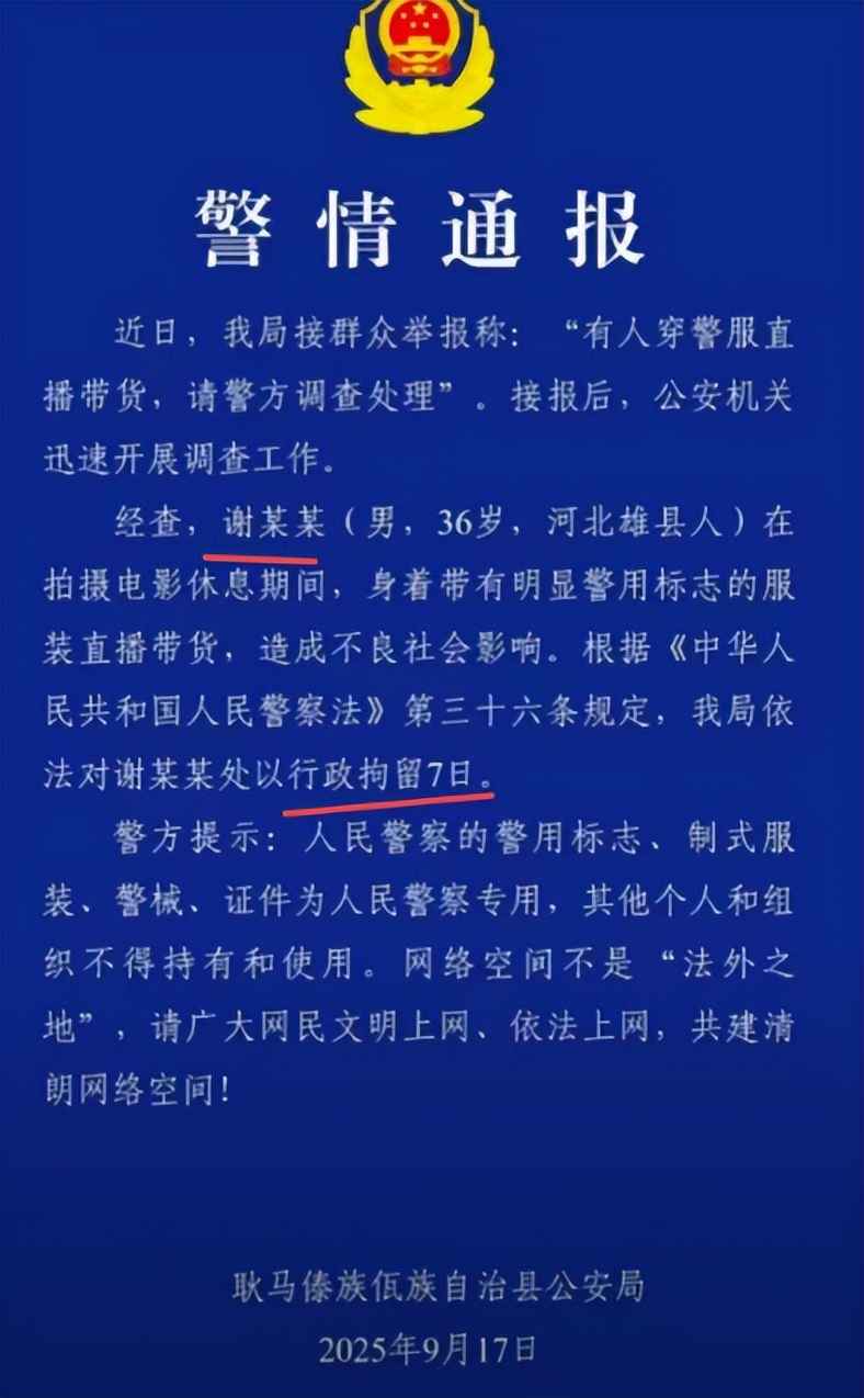 曾因饰演《小兵张嘎》而成名的演员谢孟伟,近日因在云南拍摄期间身穿警服进行直播带货,被警方依法处以行政拘留七日。