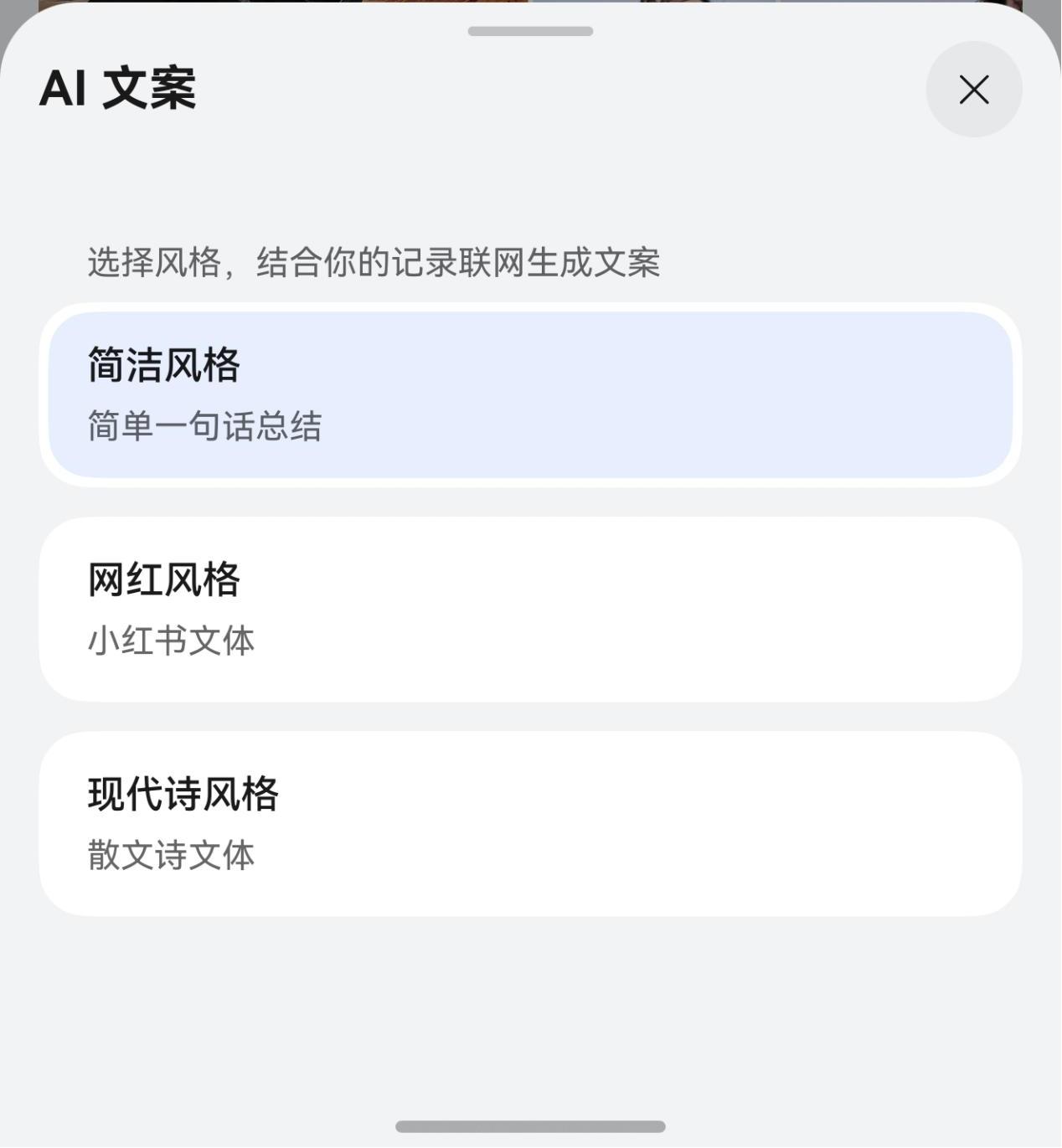 我试着点击“AI文案”功能,在“简洁风格”“网红风格”“现代诗风格”三个选项里,我选择了“现代诗风格”。几秒钟后,一段很有意境的文字便生成了,给这趟匆忙的商务旅途添了一丝文艺气息。