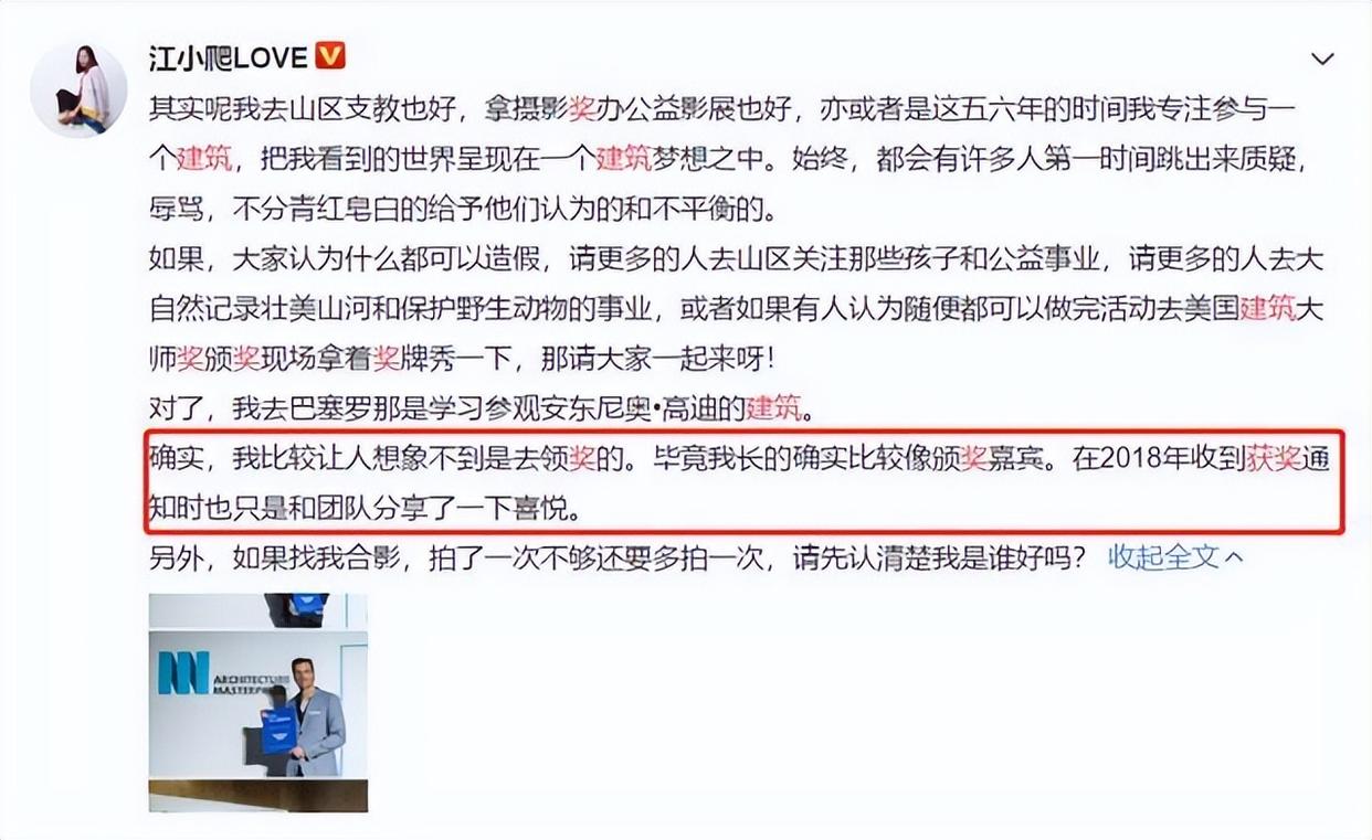 而真正让她“谎言”暴露的,是她高调炫耀获得的“国际建筑奖”。随后,原创摄影师出面澄清,指出获奖作品实为他人所有。