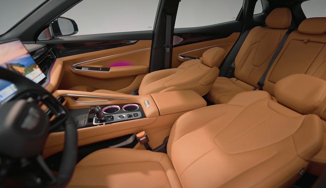 新中式设计藏着“文化巧思”。“长桥卧波”前格栅12道栅条复刻江南廊桥的秩序感,象征家人相伴的十二个时辰,镀铬与哑光的搭配如同古桥的虚实光影,白天是辨识度极高的家族标识,夜晚2.05米贯穿灯亮起如“灯火万家”,照射距离达186米,开山路也看得清路边。琉璃蓝车色源自宋代琉璃砖工艺,多层纳米涂装让阳光下车身泛着釉光,停在小区里辨识度超高。