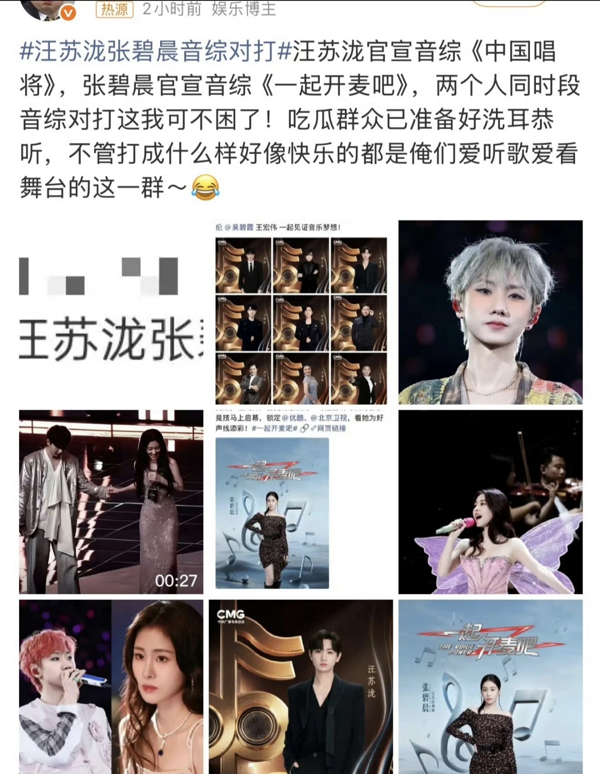 2025年的娱乐圈最近又双叒叕炸了!汪苏泷和张碧晨这对曾被粉丝嗑到上头的“OST王炸组合”,居然在音综里上演“王见王”的戏码——汪苏泷加盟《中国唱将》,张碧晨亮相《一起开麦吧》,两档节目同天开播,网友直呼:“这是要battle到地老天荒?”