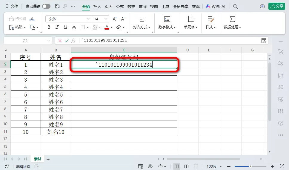 在输入身份证号码前,先输入一个英文状态的单引号('),然后再输入身份证号码。