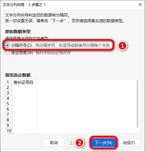 4.在文本分列向导中,选择"分隔符号"后,点击“下一步”;