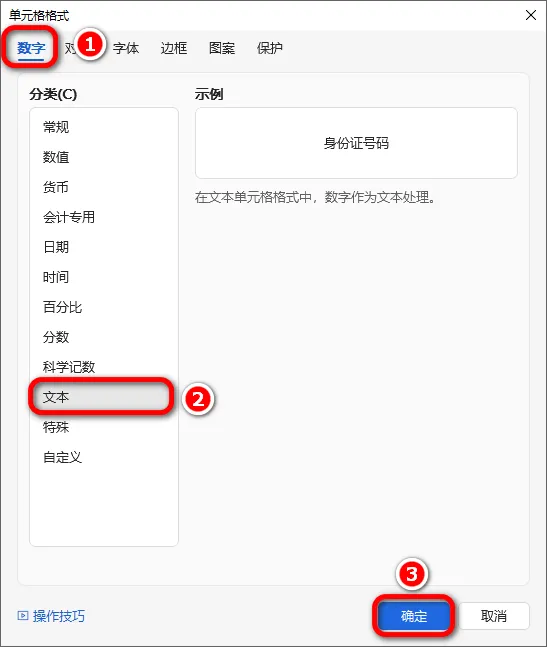 1.在"数字"选项卡中,选择"分类"里的"文本";