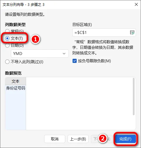 6.选择“列数据类型”中的“文本”,点击"完成"。
