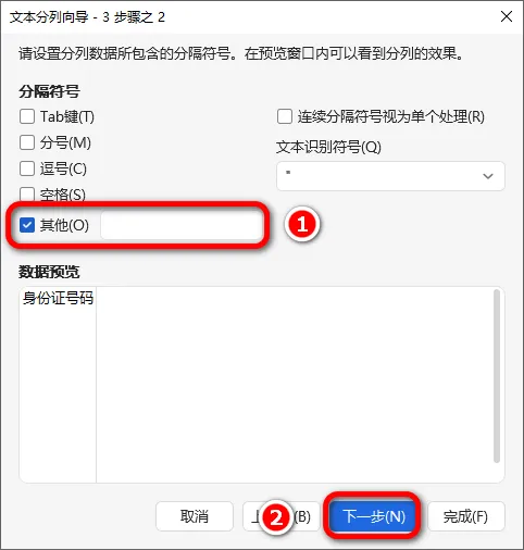 5.勾选“分隔符号”中的“其他”,文本框中什么也不输入,点击"下一步";