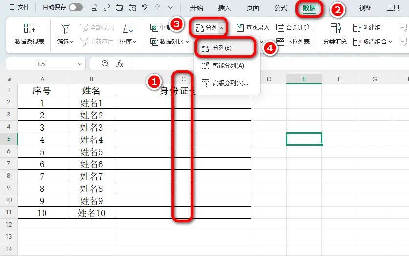 3.选择"分列"功能;