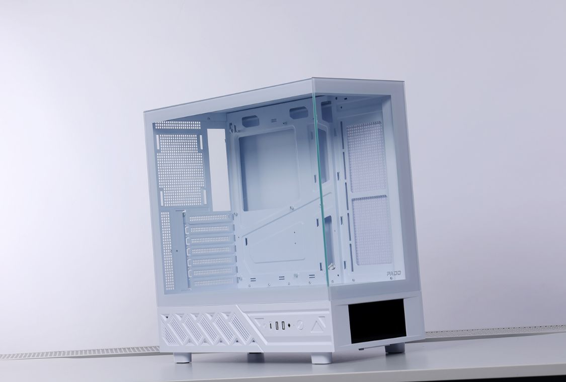 机箱结构简单,采用了大量快拆结构设计。两块钢化玻璃面板是球形卡扣的固定方式,机箱右侧带大面积散热网孔的金属面板则是卡榫+手拧螺丝的方式固定。