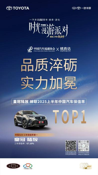 在中国汽车流通协会2025年上半年发布的保值率榜单中,一汽丰田荣获“中国汽车保值率行业标杆奖”。具体到车型,皇冠陆放在中型SUV保值率榜单中高居榜首,三年保值率达67.1%;亚洲龙则持续领跑中高级轿车及混动市场。
