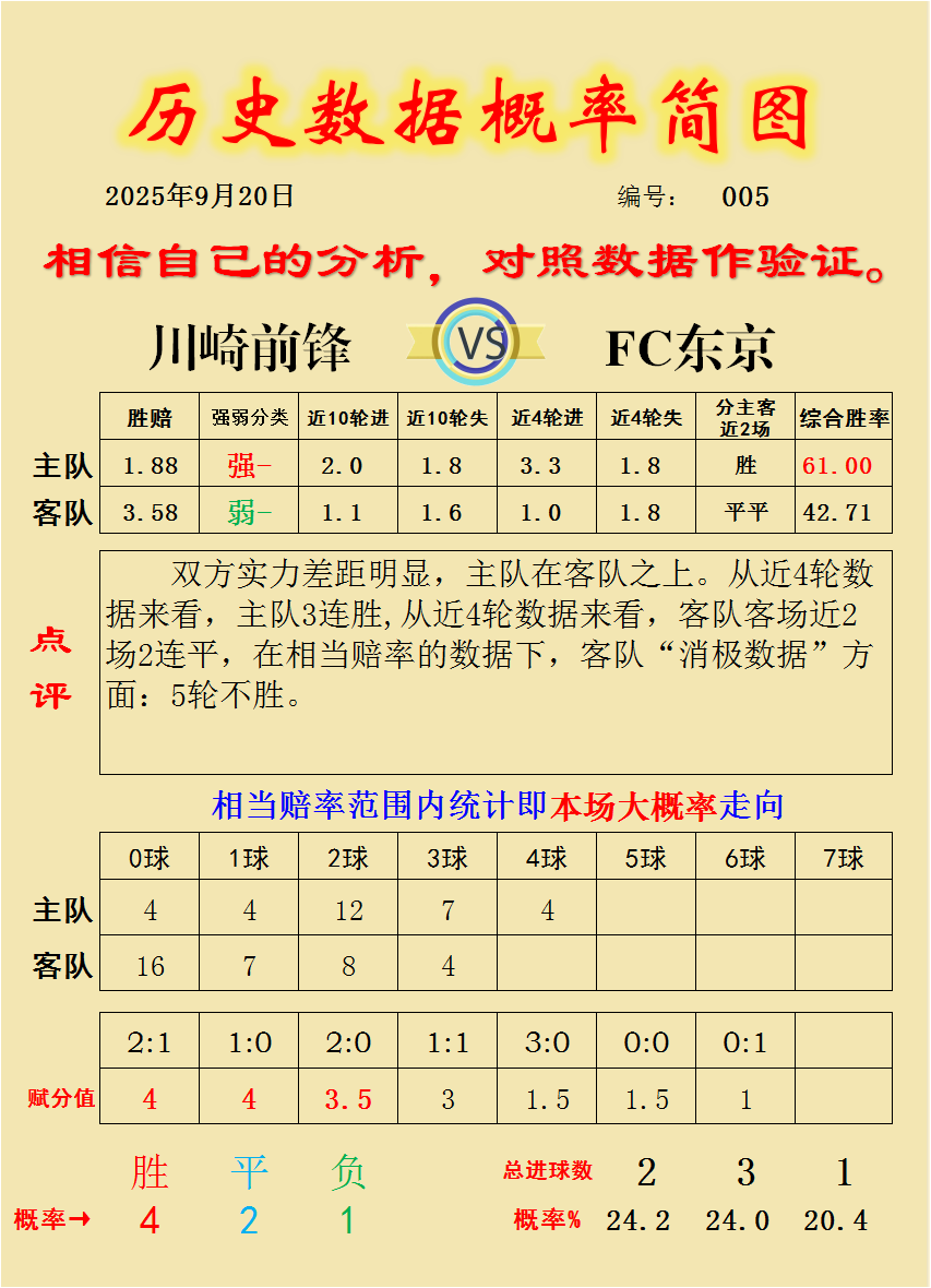 客队FC东京近5场1胜2平2负,积5个积分,其中近5个主场0胜2平3负,积2个积分。客队客场战力较弱,客场平均积分比近5轮平均积分-0.6个积分;近5场打进4球失8球,场均进0.8球,失1.6球,其中:客队客场近5场打进3球失9球,场均进0.6球,失1.8球。进攻乏力,场均进0.6球,防守相对稳固,场均失1.8球。