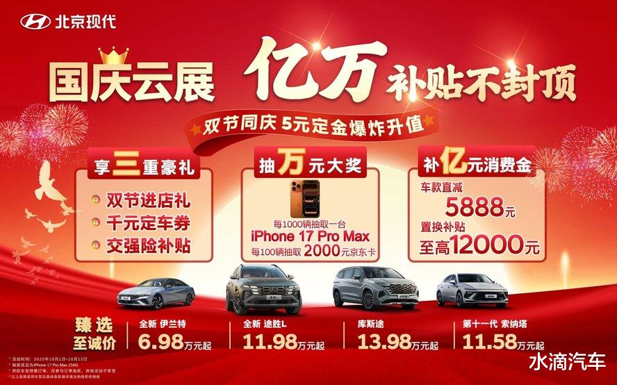 这次 “银十” 政策更是如此:5 元锁福利、真金白银补贴、全系车型覆盖,再加上四款核心车精准匹配不同需求,完全不用等到年底 “冲量”。对消费者来说,与其纠结 “年底会不会更便宜”,不如抓住当下的 “确定性优惠”—— 毕竟既有诚意政策兜底,又有实力产品护航,现在选择北京现代,就是性价比最高的决定。