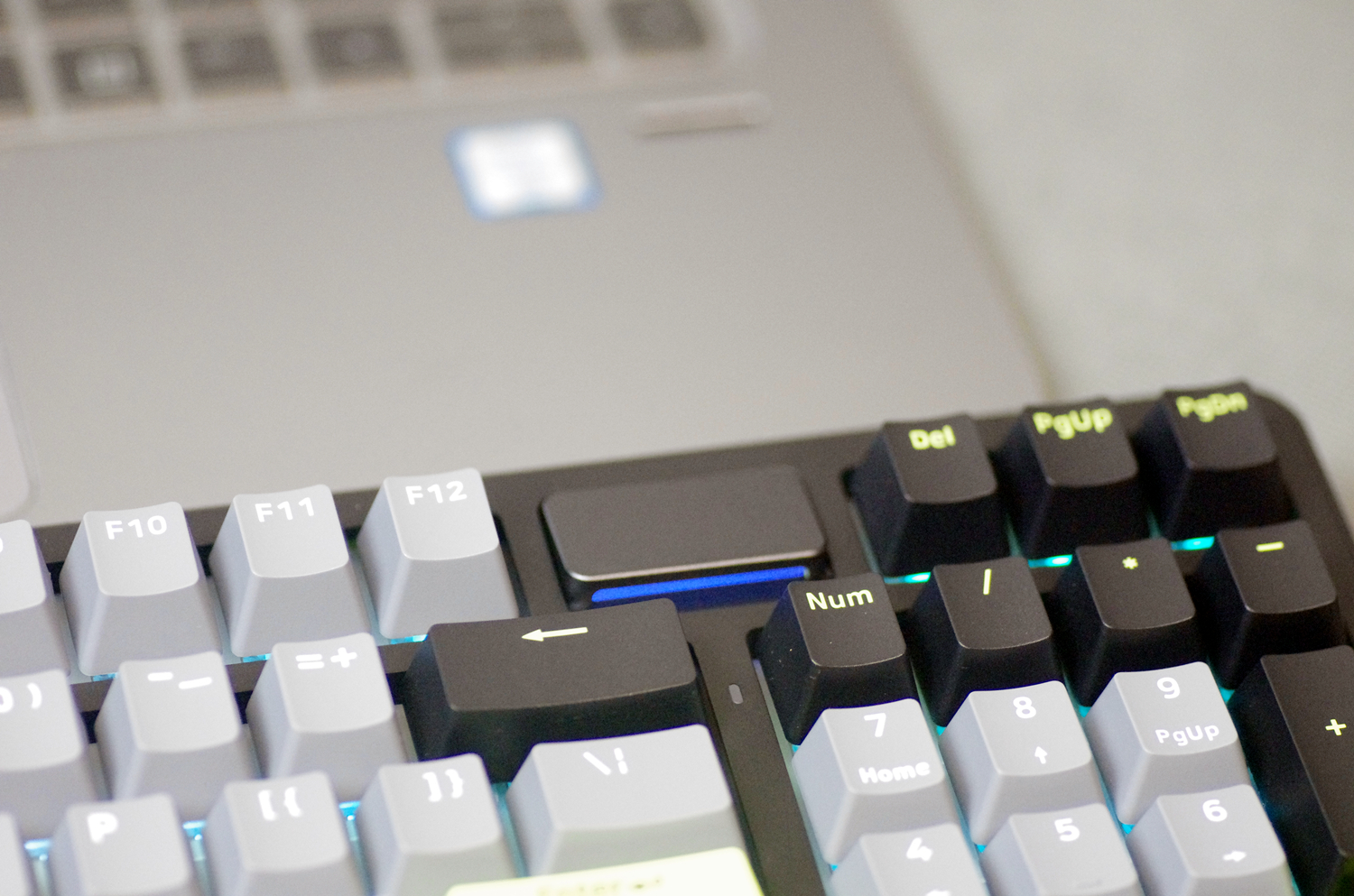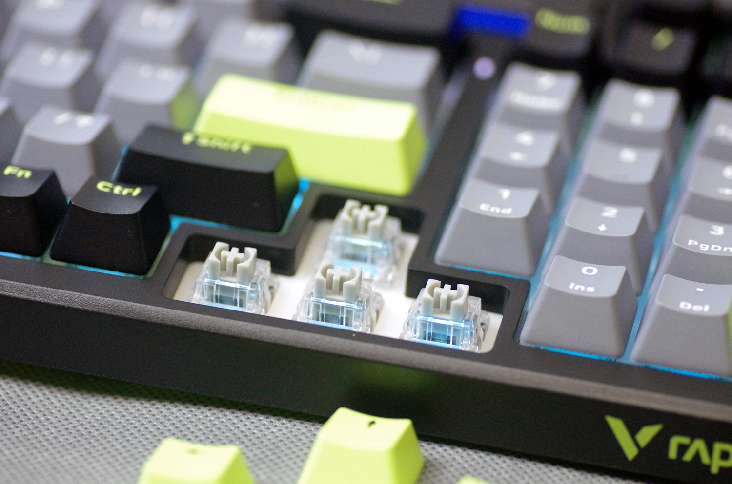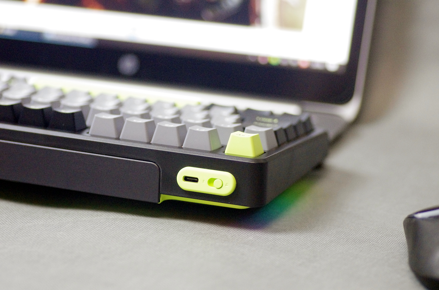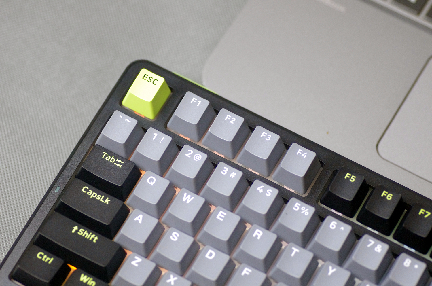键盘的外壳采用高质量的ABS材质,表面经过细磨砂处理,不仅坚固耐用,而且手感细腻。键盘提供幻影机甲(白蓝灰)、初号骑士(黑绿灰)和莫奈仙踪(白蓝粉)三种配色款式,我所入手的是初号骑士(黑绿灰)版本,感觉更沉稳一些。