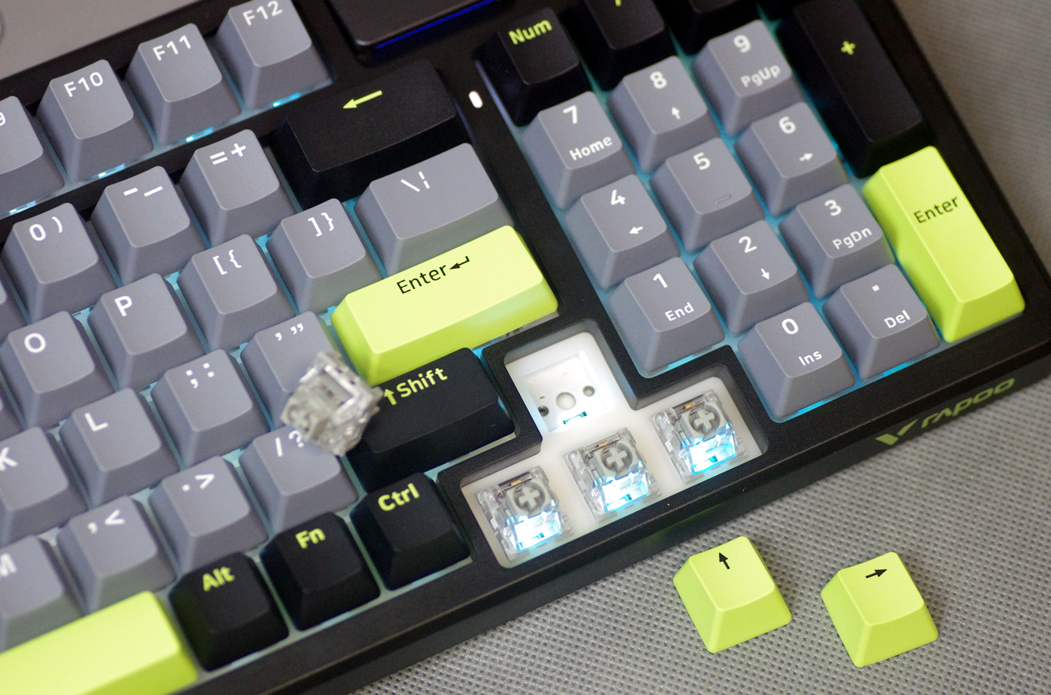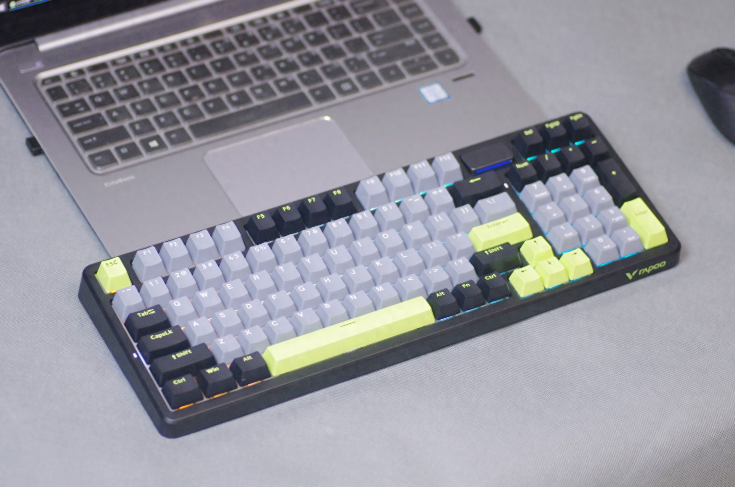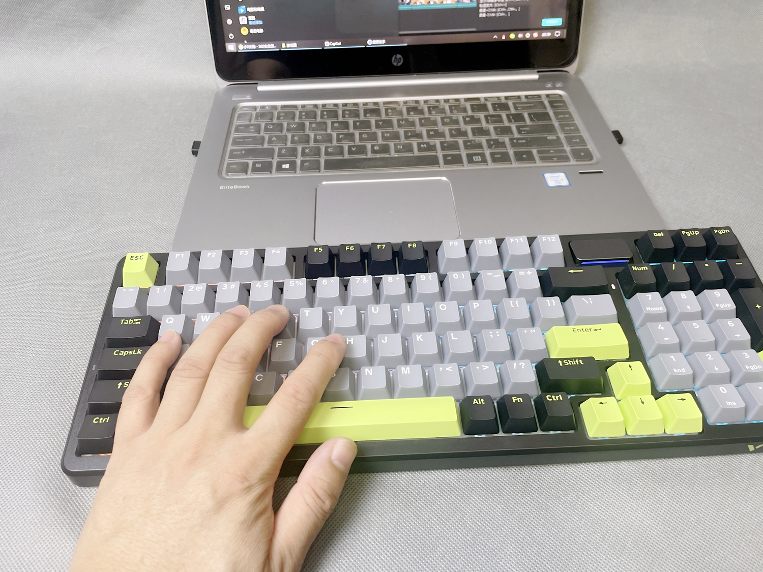 键盘的外壳采用高质量的ABS材质,表面经过细磨砂处理,不仅坚固耐用,而且手感细腻。键盘提供幻影机甲(白蓝灰)、初号骑士(黑绿灰)和莫奈仙踪(白蓝粉)三种配色款式,我所入手的是初号骑士(黑绿灰)版本,感觉更沉稳一些。