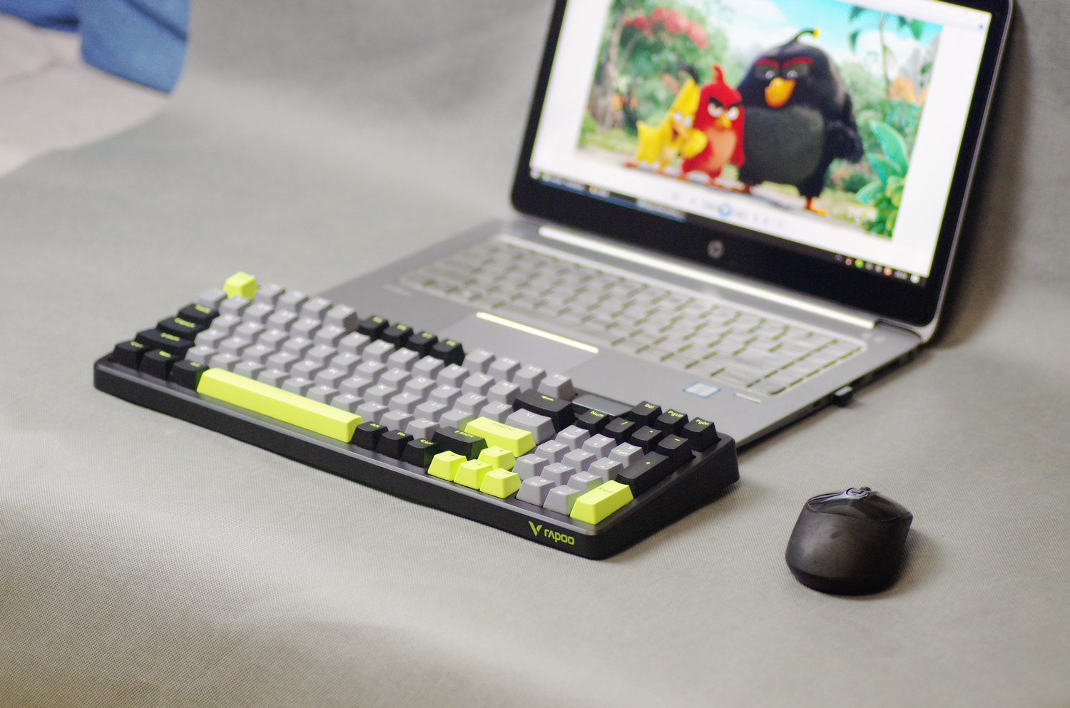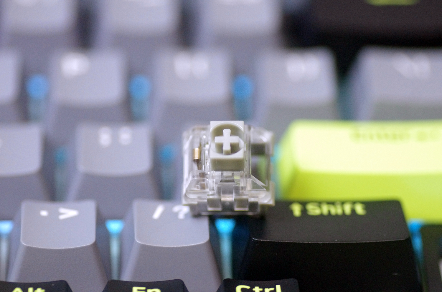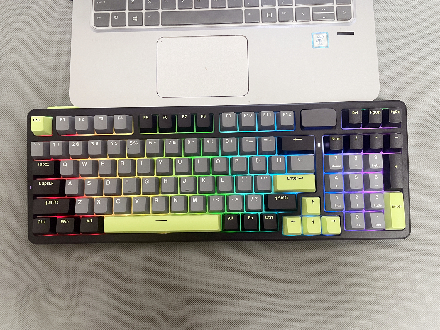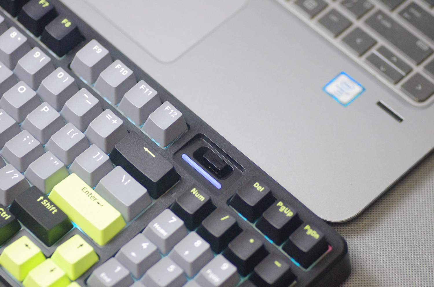 键盘的外壳采用高质量的ABS材质,表面经过细磨砂处理,不仅坚固耐用,而且手感细腻。键盘提供幻影机甲(白蓝灰)、初号骑士(黑绿灰)和莫奈仙踪(白蓝粉)三种配色款式,我所入手的是初号骑士(黑绿灰)版本,感觉更沉稳一些。
