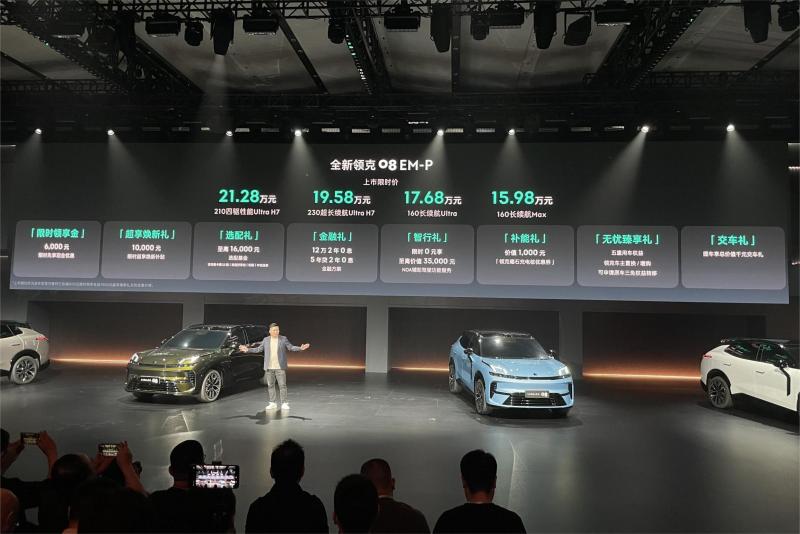 9月24日,全新领克08 EM-P正式上市。新车全新标配激光雷达,推出两款搭载千里浩瀚辅助驾驶H5方案的车型和两款搭载千里浩瀚辅助驾驶H7方案的车型,分别为160长续航Max、160长续航Ultra、230超长续航Ultra H7、210四驱性能Ultra H7四款配置,官方限时售价区间为15.98万-21.28万元。同时,领克还推出8重限时购车权益,涵盖领享金、超享焕新礼、选配礼、金融礼、智行礼、补能礼、无忧臻享礼、交车礼等多重福利,进一步降低用户拥车门槛。