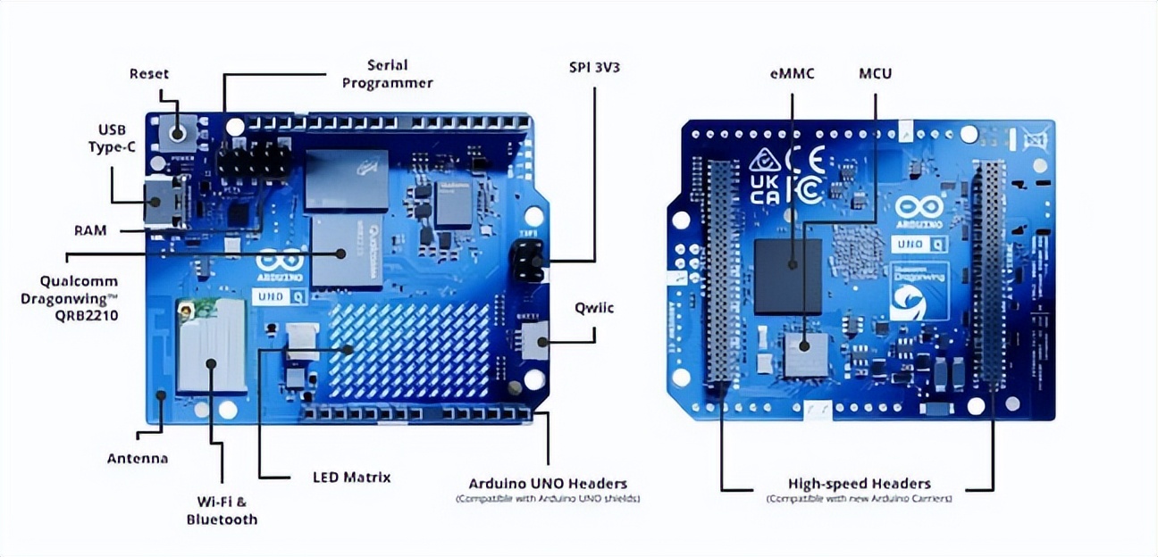 在硬件配置上,UNO Q 板载了 Wi-Fi 和蓝牙功能,并配备了 eMMC 闪存用作存储。它既保留了与传统 Arduino 扩展板兼容的接口,确保了生态的延续性,也增加了新的高速接口,以释放高通芯片的全部潜力。