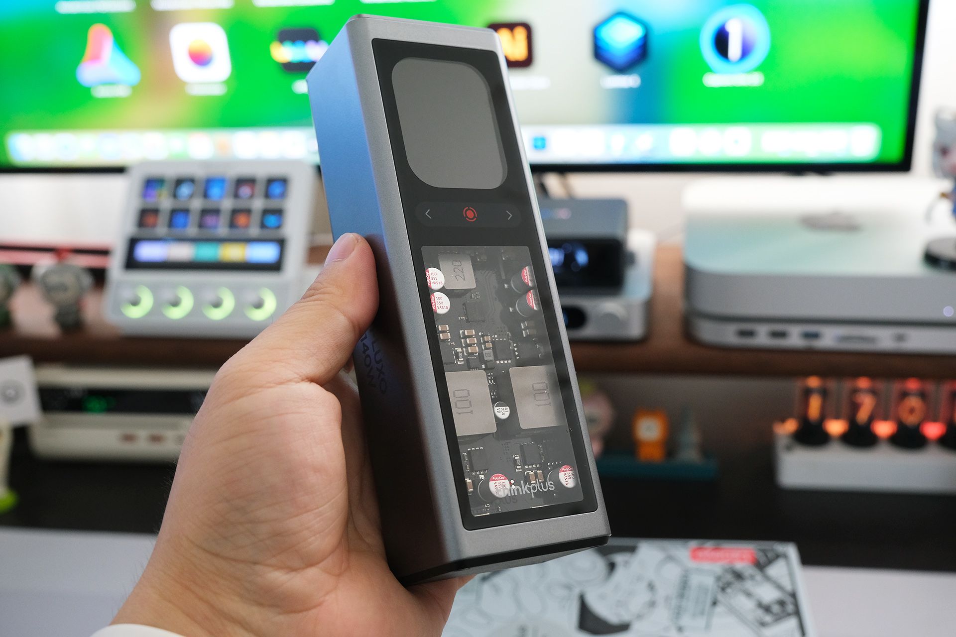 这款移动电源设计紧凑,尺寸为155*51*40mm,手感出色,重量为420g。透明朋赛博克风设计让这款移动电源识别度很高,无论是使用还是当桌搭摆件也是不错。20000mAh的超大容量为其提供了强大的续航底气,远超普通移动电源,可满足多设备充电需求。