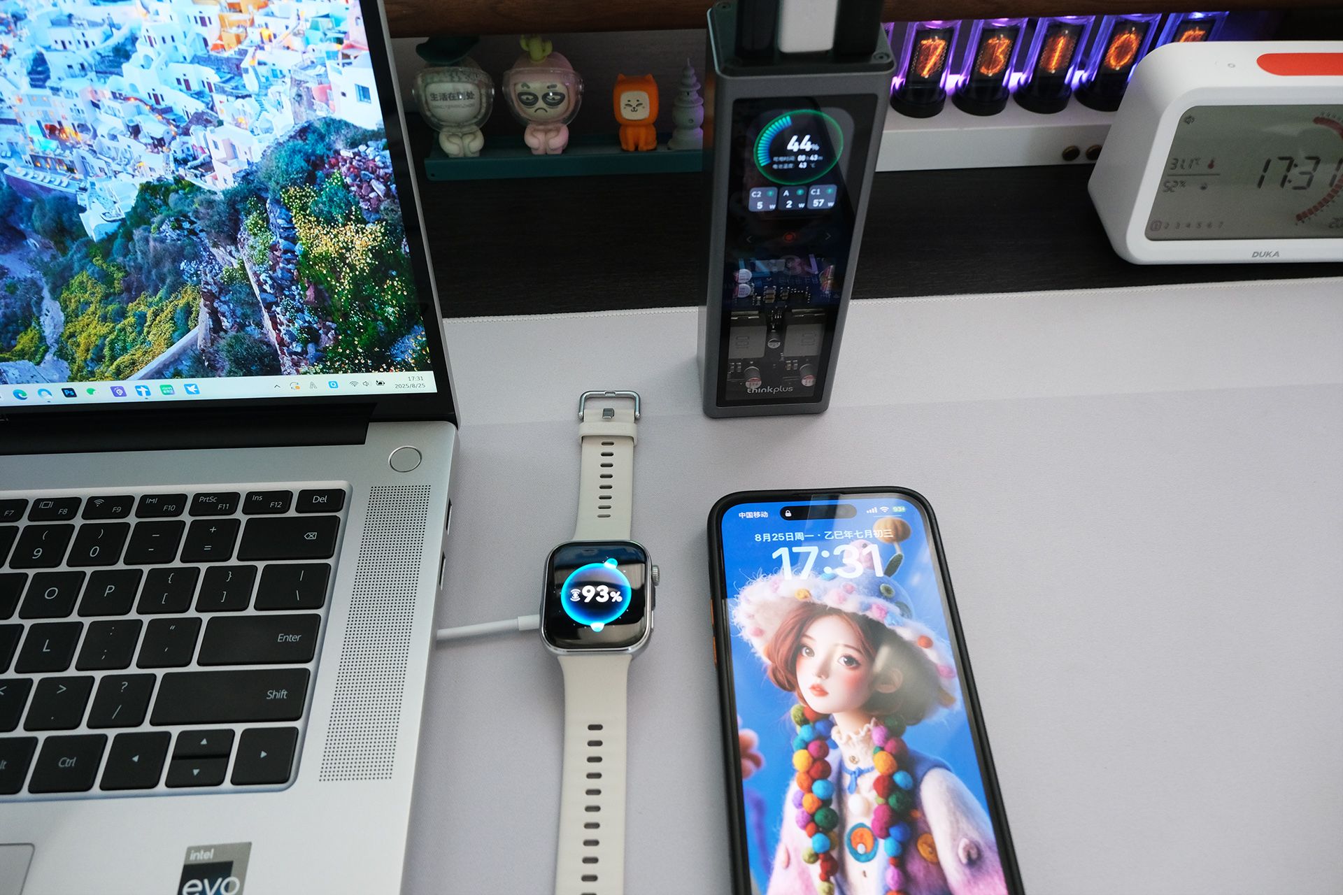 如上图所示,三款设备同时充电,充电宝也完全能胜任。它支持华为Matebook Pro 16s 笔记本的充电,笔记本充电功率达到了61W左右。智能手表、手机充电速度也很快,一会就补充到了88%的电量,还是非常方便的。