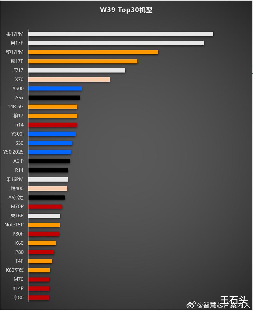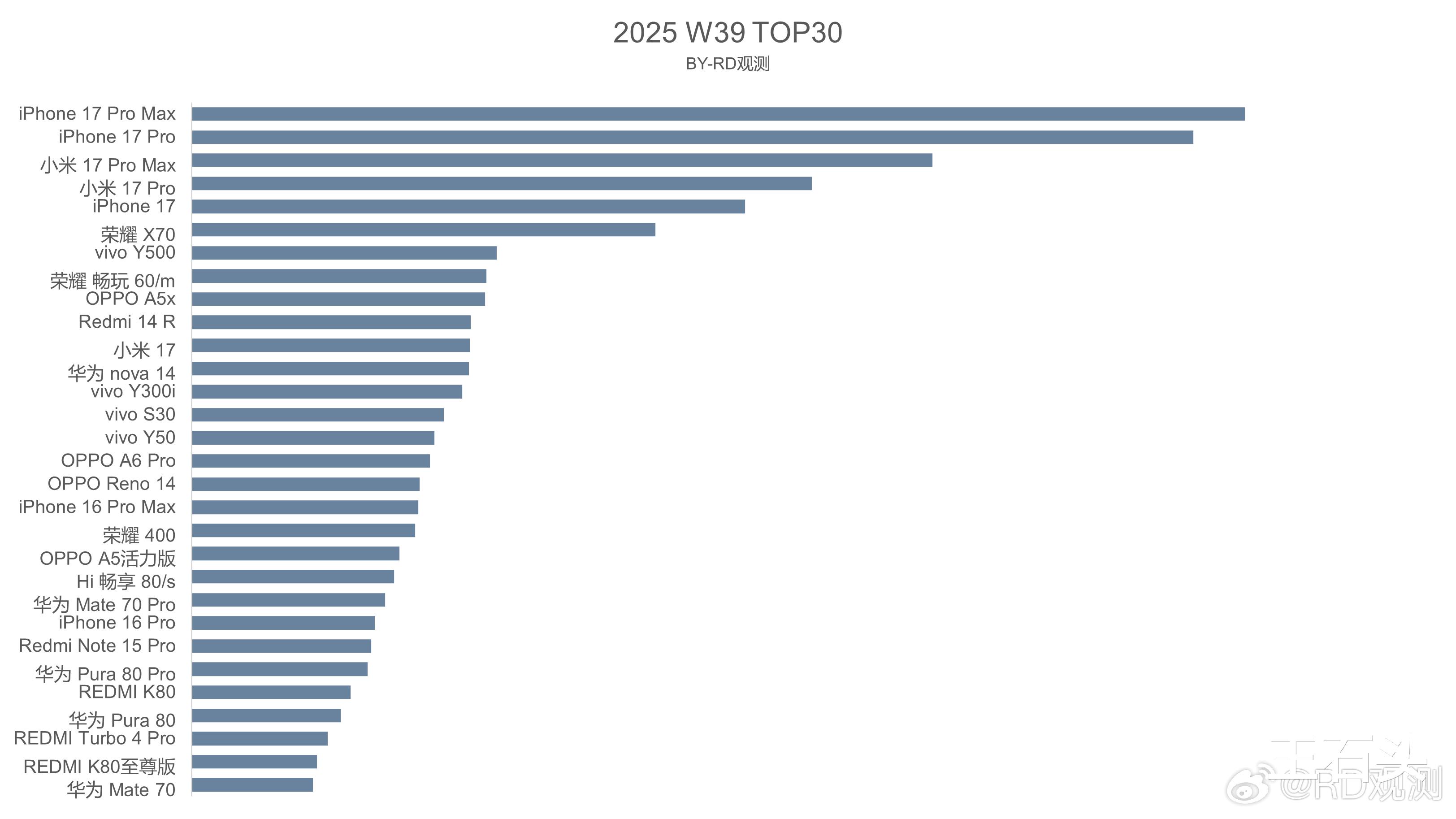 iPhone 17 Pro Max位居榜首,iPhone 17 Pro紧随其后,小米17 Pro Max和17 Pro分别位列第三、四名,iPhone 17标准版排在第五。