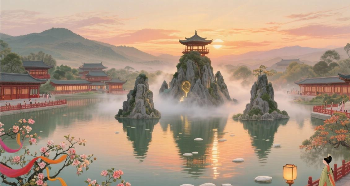 2. 湖山之间的「奢华景观」:不只是大,更是「精」西苑的厉害之处不只是大,更在于它把自然景观和人工建筑结合到了极致。先说那座积翠池,《大业杂记》里说它「东西凡十里,南北五里」,相当于现在7个标准足球场那么大。池子里的水是从洛河里引过来的,清澈见底,隋炀帝还让人在池底铺了一层磨得光滑的白石,阳光一照,整个池子都亮晶晶的。