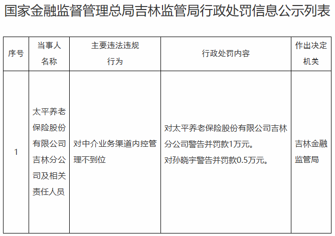 10月10日,根据国家金融监督管理总局吉林监管局发布的公告,太平养老保险股份有限公司吉林分公司及孙晓宇因对中介业务渠道内控管理不到位分别被警告并处以1万元和0.5万元罚款。
