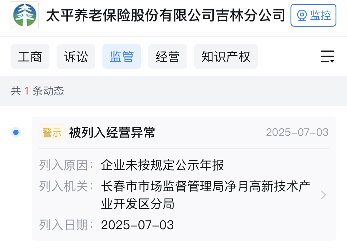 此外,据天眼查APP,太平养老保险股份有限公司吉林分公司还曾因未按规定公示年报被列入经营异常。