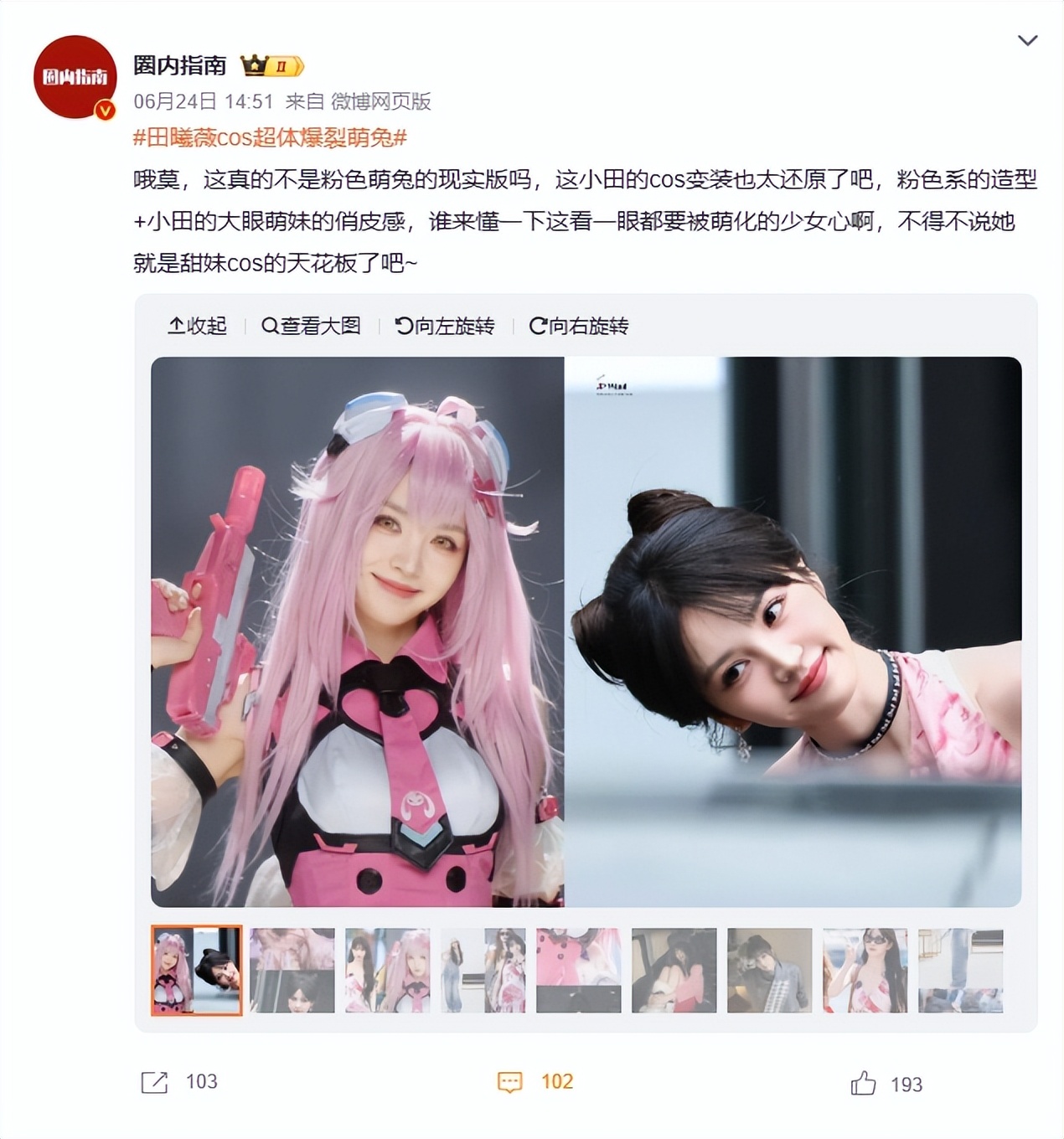 从契合度来说,邀请田曦薇来COS爆裂萌兔这个形象在选角上已经赢了一半,而在真正的COS形象出来之后,网友更是表示,也只有田曦薇能把这个COS撑起来,简直就是现实版萌兔。