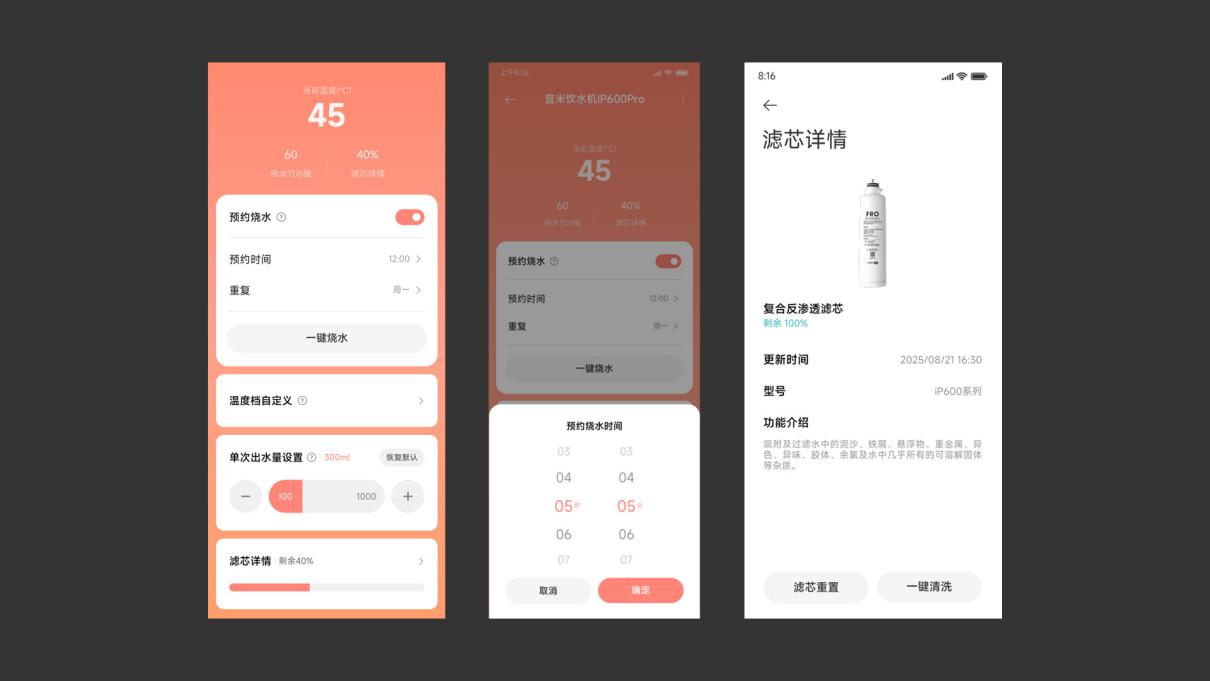 另外,这台宜米RO熟水即热净饮机还接入了米家APP,其中“预约熟水”的功能就很实用。头一天晚上设定好,第二天早晨一醒来就有热水可以喝,早餐冲奶或者泡蜂蜜茶可以直接拿来用,虽然它加热的速度也很快,但工作日早晨的时间真的是能省一会儿是一会儿。还有滤芯寿命监测、滤芯清洗、调节温度和水量等功能。