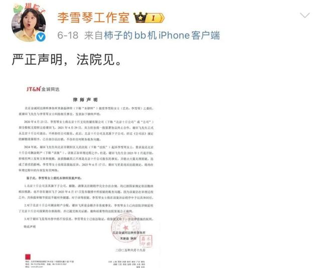 面对指控,李雪琴团队先以 “让事实说话” 模糊回应,后发布声明称公司清算合法合规,指谢田飞 “已免费获得股权并签协议退出”,且已提起反诉。