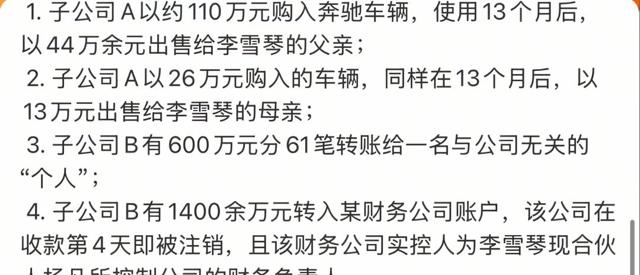 更让矛盾激化的是李雪琴一系列的骚操作:一辆 110 万购入的奔驰车,一年多后以 44 万卖给了自己亲爹,26 万的车以 13 万转给自己的母亲。