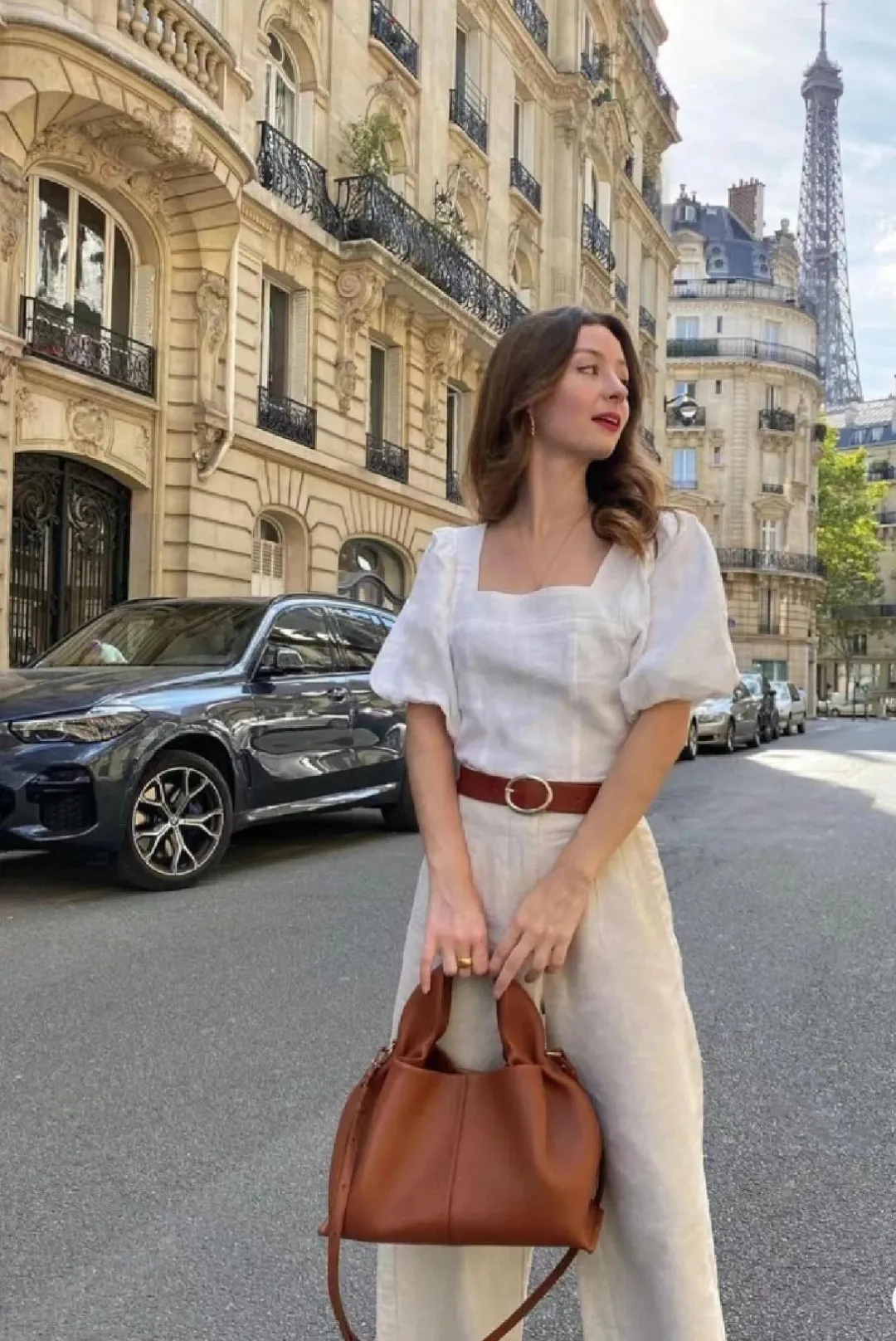 依据色系呼应的原则,选择与腰带同色系的包包,整套穿搭非常简约气质又不失小心机~